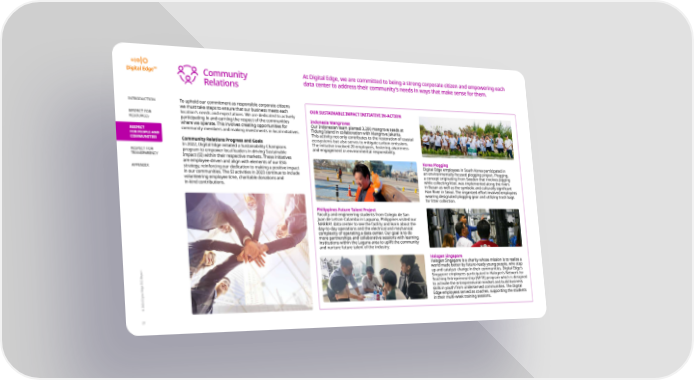 Community At Digital Edge, we are committed to being a strong corporate citizen and empowering each Relations data center to address their community’s needs in ways that make sense for them. INTRODUCTION To uphold our commitment as responsible corporate citizens OUR SUSTAINABLE IMPACT INITIATIVE IN-ACTION we must take steps to ensure that our business meets each RESPECT FOR location’s needs and expectations. We are dedicated to actively Indonesia Mangroves participating in and earning the respect of the communities RESOURCES Our Indonesian team planted 3,200 mangrove seeds at where we operate. This involves creating opportunities for Tidung Island in collaboration with Mangrove Jakarta. RESPECT community members and making investments in local initiatives. FOR PEOPLE AND This activity not only contributes to the restoration of coastal COMMUNITIES Community Relations Progress and Goals ecosystems but also serves to mitigate carbon emissions. The initiative involved 20 employees, fostering awareness In 2022, Digital Edge initiated a Sustainability Champions and engagement in environmental responsibility. RESPECT FOR program to empower local leaders in driving Sustainable TRANSPARENCY Impact (SI) within their respective markets. These initiatives Korea Plogging are employee-driven and align with elements of our ESG Digital Edge employees in South Korea participated in strategy, reinforcing our dedication to making a positive impact APPENDIX an environmentally focused plogging project. Plogging, in our communities. The SI activities in 2023 continue to include volunteering employee time, charitable donations and a concept originating from Sweden that involves jogging while collecting litter, was implemented along the rivers in-kind contributions. in Busan as well as the symbolic and culturally signi昀椀cant Han River in Seoul. The organized e昀昀ort involved employees wearing designated plogging gear and utilizing trash bags for litter collection. Philippines Future Talent Project Faculty and engineering students from Colegio de San Juan de Letran-Calamba in Laguana, Philippines visited our NARRA1 data center to see the facility and learn about the day-to-day operations and the electrical and mechanical complexity of operating a data center. Our goal is to do more partnerships and collaborative sessions with learning institutions within the Laguna area to uplift the community and nurture future talent of the industry. Halogen Singapore Halogen Singapore is a charity whose mission is to realize a world made better by future-ready young people, who step up and catalyze change in their communities. Digital Edge’s Singapore employees participated in Halogen’s Network for Teaching Entrepreneurship (NFTE) program which is designed to activate the entrepreneurial mindset and build business skills in youth from underserved communities. The Digital Edge employees served as coaches, supporting the students © 2024 Digital Edge ESG Report in their multi-week training sessions. 27