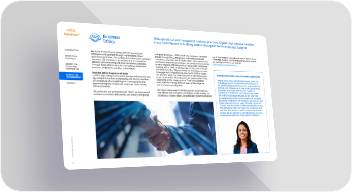 Business Through ethical and transparent business practices, Digital Edge remains steadfast Ethics in our commitment to building best-in-class governance across our footprint. INTRODUCTION We foster a shared set of values and ethics among our and good governance. 100% of our new employees have been use of Digital Edge’s networks and more. A full list of our employees and partners through implementing robust trained through TRACE focusing on individual policies and committee charters, policies and governance documents RESPECT FOR governance practices. This includes anti-bribery and corruption compliance processes. For all Digital Edge’s sales, construction are publicly available on our website: measures, tax compliance, prevention of anti-competitive and 昀椀nance department employees, we conducted live training digitaledgedc.com/governance. RESOURCES behavior, whistleblowing and other compliance protocols. on zero tolerance of bribery and corruption (ABC Compliance Through these e昀昀orts, we build trust with our customers, RESPECT FOR Training) with a 100% completion rate. In 2023, we continued investors, employees and other stakeholders. our Third-Party Due Diligence Policy for all third parties prior PEOPLE AND COMMUNITIES to engagement. This policy was launched in 2022 to ensure DIGITAL EDGE HIRES HEAD OF GLOBAL COMPLIANCE Business Ethics Progress and Goals our partners apply the same standards of business conduct In 2023, Digital Edge continued to develop and operationalize RESPECT FOR as we do ourselves. All third parties are subject to the Policy. Meghal Vakil, Senior Compliance Counsel, joined the TRANSPARENCY key compliance policies and practices. We hired a new Head Depending on the category of the Third Party (and their Digital Edge team in 2023 to oversee the revision of of Compliance who is updating our current policies and associated Risk Rating), di昀昀erent levels of due diligence our existing policies and direct ethics and compliance, spearheading new initiatives to ensure we retain strong, and procedures are required. APPENDIX training, risk mitigation and data privacy governance ethical standards. initiatives. She brings with her over 18 years of We have in place several individual policies and procedures experience in technology law, food law, real estate We continued our partnership with TRACE, an international that address anti-corruption, anti-bribery, insider trading, tax law and contract documentation. In her prior role, business association dedicated to anti-bribery, compliance compliance, modern slavery, whistleblower concerns processes, she spearheaded Global Ethics Compliance, managing ethics and compliance, risk mitigation, data privacy and digital legal contracts. As a part of the Tata group for 13 years, she has worked in di昀昀erent industries such as Manufacturing, Retail and FMCG with companies such as Voltas, Tata Starbucks and Tata Consumer Products Limited. We are pleased to have Meghal join our team to ensure we retain our robust, ethical standards. © 2024 Digital Edge ESG Report 29
