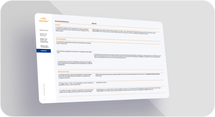 Recommended Disclosure Response Strategy C. Describe the resilience of the organization’s strategy, taking into Digital Edge has set a goal to achieve carbon neutrality in our Scope 1 and 2 emissions by 2030, aligning those goals with the Science-Based Targets consideration di昀昀erent climate-related scenarios, including a 2°C or initiative (SBTi) 1.5°C or lower scenario as well as iMasons Climate Accord drive for carbon neutrality goal in digital infrastructure. lower scenario. INTRODUCTION RESPECT FOR RESOURCES RESPECT FOR Risk Management PEOPLE AND A. Describe the organization’s processes for identifying and assessing COMMUNITIES climate-related risks. RESPECT FOR TRANSPARENCY APPENDIX B. Describe the organization’s processes for managing climate-related risks. The ESG Steering Committee meets regularly and works in partnership with Digital Edge’s Board of Managers to regularly update our materiality study and identify climate-related risks for our business. We will continue to use external tools including Jupiter Intelligence to complete site-by-site analysis of local risks and incorporate those risks into our business planning processes. C. Describe how processes for identifying, assessing, and managing climate-related risks are integrated into the organization’s overall risk management. Metrics and Targets A. Disclose the metrics used by the organization to assess climate- Material topics and key performance indicators related to environment and climate-related risks can be found in the Respect for Resources section related risks and opportunities in line with its strategy and risk of this report. management process. B. Disclose Scope 1, Scope 2, and, if appropriate, Scope 3 greenhouse See p.13 of this report. gas (GHG) emissions, and the related risks. C. Describe the targets used by the organization to manage climate- Digital Edge has set a goal to achieve carbon neutrality in our Scope 1 and 2 emissions by 2030, aligning those goals with the Science-Based Targets related risks and opportunities and performance against targets. initiative (SBTi) 1.5°C or lower scenario as well as iMasons Climate Accord drive for carbon neutrality goal in digital infrastructure. © 2024 Digital Edge ESG Report 41