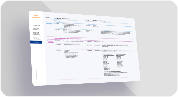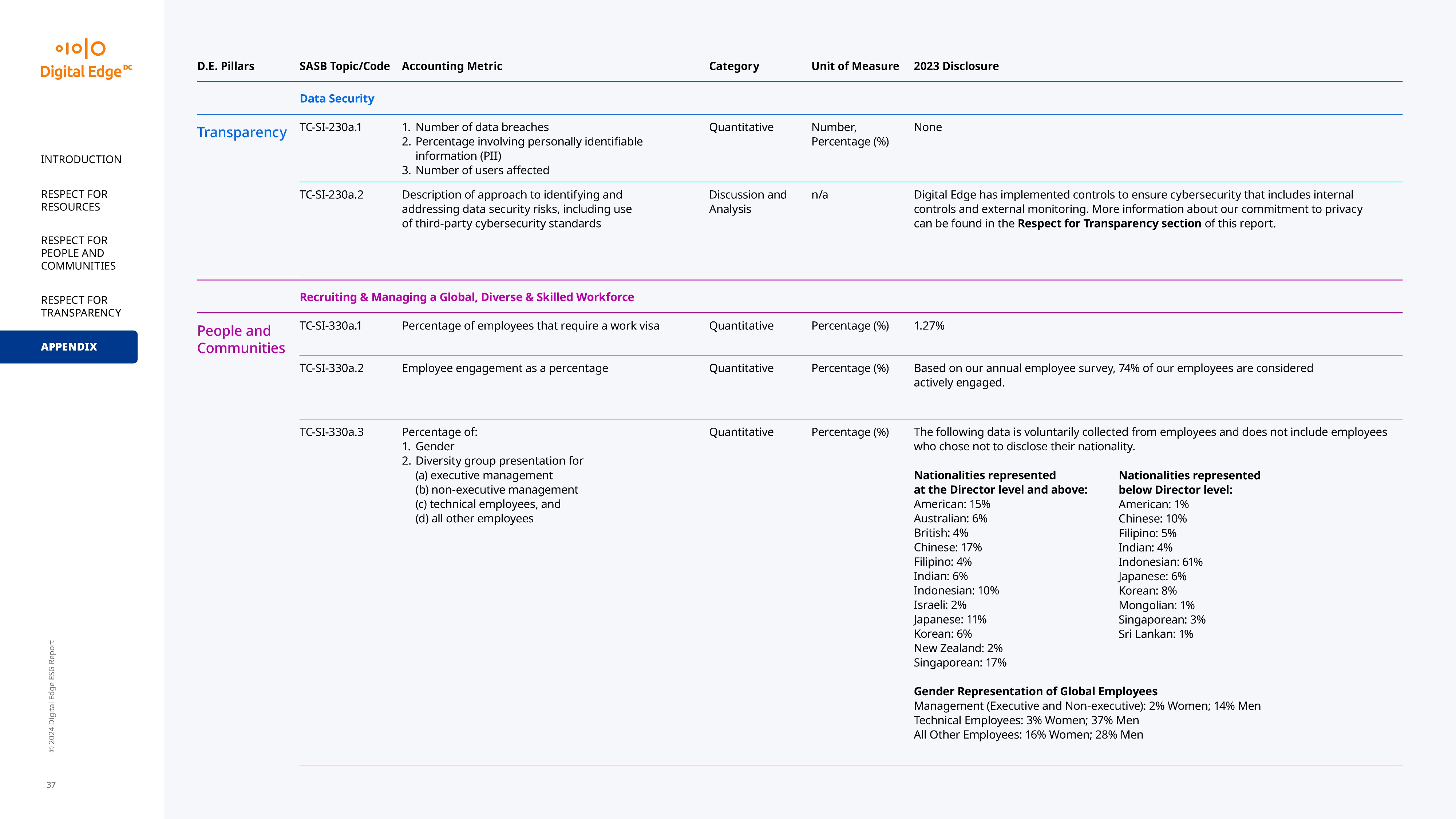 D.E. Pillars SASB Topic/Code Accounting Metric Category Unit of Measure 2023 Disclosure Data Security TC-SI-230a.1 1. Number of data breaches Transparency Quantitative Number, None 2. Percentage involving personally identi昀椀able Percentage (%) information (PII) INTRODUCTION 3. Number of users a昀昀ected RESPECT FOR TC-SI-230a.2 Description of approach to identifying and Discussion and n/a Digital Edge has implemented controls to ensure cybersecurity that includes internal RESOURCES addressing data security risks, including use Analysis controls and external monitoring. More information about our commitment to privacy of third-party cybersecurity standards can be found in the Respect for Transparency section of this report. RESPECT FOR PEOPLE AND COMMUNITIES RESPECT FOR Recruiting & Managing a Global, Diverse & Skilled Workforce TRANSPARENCY People and TC-SI-330a.1 Percentage of employees that require a work visa Quantitative Percentage (%) 1.27% APPENDIX Communities TC-SI-330a.2 Employee engagement as a percentage Quantitative Percentage (%) Based on our annual employee survey, 74% of our employees are considered actively engaged. TC-SI-330a.3 Percentage of: Quantitative Percentage (%) The following data is voluntarily collected from employees and does not include employees 1. Gender who chose not to disclose their nationality. 2. Diversity group presentation for (a) executive management Nationalities represented Nationalities represented (b) non-executive management at the Director level and above: below Director level: (c) technical employees, and American: 15% American: 1% (d) all other employees Australian: 6% Chinese: 10% British: 4% Filipino: 5% Chinese: 17% Indian: 4% Filipino: 4% Indonesian: 61% Indian: 6% Japanese: 6% Indonesian: 10% Korean: 8% Israeli: 2% Mongolian: 1% Japanese: 11% Singaporean: 3% Korean: 6% Sri Lankan: 1% New Zealand: 2% Singaporean: 17% Gender Representation of Global Employees Management (Executive and Non-executive): 2% Women; 14% Men Technical Employees: 3% Women; 37% Men © 2024 Digital Edge ESG Report All Other Employees: 16% Women; 28% Men 37