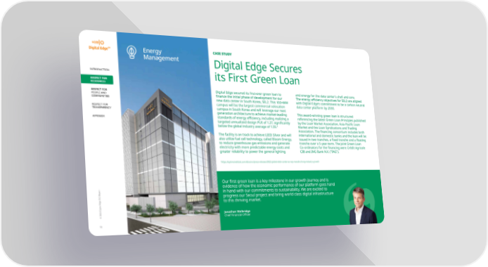 Energy CASE STUDY Management Digital Edge Secures INTRODUCTION its First Green Loan RESPECT FOR RESOURCES RESPECT FOR Digital Edge secured its 昀椀rst-ever green loan to and energy for the data center’s shell and core. 昀椀nance the initial phase of development for our The energy e昀케ciency objectives for SEL2 are aligned PEOPLE AND COMMUNITIES new data center in South Korea, SEL2. This 100+MW with Digital Edge’s commitment to be a carbon neutral campus will be the largest commercial colocation data center platform by 2030. RESPECT FOR campus in South Korea and will leverage our next TRANSPARENCY generation architecture to achieve market-leading This award-winning green loan is structured standards of energy e昀케ciency, including realizing a referencing the latest Green Loan Principles published APPENDIX targeted annualized design PUE of 1.27, signi昀椀cantly by the Loan Market Association, Asia-Paci昀椀c Loan 4 below the global industry average of 1.55. Market and the Loan Syndications and Trading Association. The 昀椀nancing consortium includes both The facility is on track to achieve LEED Silver and will international and domestic banks and the loan will be also utilize fuel cell technology, called Bloom Energy, issued in two tranches, a 昀椀xed tranche and a 昀氀oating to reduce greenhouse gas emissions and generate tranche over a 5-year term. The joint Green Loan electricity with more predictable energy costs and Co-ordinators for the 昀椀nancing were Crédit Agricole greater reliability to power the general lighting CIB and ING Bank N.V. (“ING”). 4 https://uptimeinstitute.com/about-ui/press-releases/2022-global-data-center-survey-reveals-strong-industry-growth Our 昀椀rst green loan is a key milestone in our growth journey and is evidence of how the economic performance of our platform goes hand in hand with our commitments to sustainability. We are excited to progress our Seoul project and bring world class digital infrastructure to this thriving market. © 2024 Digital Edge ESG Report Jonathan Walbridge Chief Financial O昀케cer 16