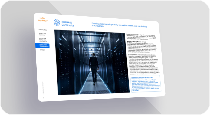 Business Ensuring uninterrupted operability is crucial for the long-term sustainability Continuity of our business. INTRODUCTION Digital Edge is dedicated to safeguarding against key risks such as weather-related incidents, 昀氀oods and 昀椀re. We remain steadfast RESPECT FOR in providing our customers and partners with the uninterrupted operability needed in today’s digital landscape. RESOURCES RESPECT FOR Business Continuity Progress and Goals PEOPLE AND In 2023, Digital Edge achieved 100% uptime in all our data COMMUNITIES centers and had no information security incidents. As the digital landscape changes, we are raising the standard of infrastructure RESPECT FOR in both the developed and emerging markets to future-proof our TRANSPARENCY business. We take a proactive approach and invest in enterprise risk management (ERM) to maintain uptime performance and protect against potential business interruptions. APPENDIX Our state-of-the-art infrastructure addresses considerations like weather, seismic activity, access to water, 昀椀re suppression systems, emergency management systems and other integrations to ensure business continuity. We are also deploying technologies like big data and robotics in key facilities to monitor and optimise data in real time, maximise uptime and enhance overall e昀케ciency. In 2023, Digital Edge conducted our 昀椀rst emergency simulation training to test and evaluate the e昀昀ectiveness of our escalation process 昀氀ow. The exercise identi昀椀ed strengths, weaknesses and areas for improvement in response procedures as well as the team’s readiness in handling such incidents. We continue to improve our escalation processes and utilize our Risk Management Policy that provides a framework to assess, monitor and mitigate risks across our footprint. ASSESSING CLIMATE RISK AND RESILIENCE In 2023, we continued our collaboration with Jupiter Intelligence, a renowned authority in climate risk analytics, to perform climate risk analysis for all Digital Edge data center locations. Jupiter’s ClimateScore™ Planning incorporates a comprehensive set of applications for asset-level physical risk analysis, providing our leaders with insights into potential impacts of weather events on © 2024 Digital Edge ESG Report our facilities. 32