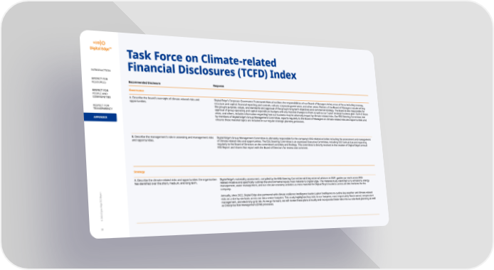 Task Force on Climate-related Financial Disclosures (TCFD) Index INTRODUCTION RESPECT FOR Recommended Disclosure Response RESOURCES RESPECT FOR Governance PEOPLE AND A. Describe the board’s oversight of climate-related risks and Digital Edge’s Corporate Governance Framework Manual outlines the responsibilities of our Board of Managers in key areas of focus including strategy, COMMUNITIES opportunities. structure and capital, 昀椀nancial reporting and controls, culture, corporate governance, and other areas. Matters of the Board of Managers include setting RESPECT FOR the group’s purpose, values, and standards and approval of the group’s long-term objectives and commercial strategy. The Board is also responsible for approval of group operating and capital expenditure budgets and any material changes to them as well as our 3-year strategic business plan. Each of these TRANSPARENCY areas, and others, includes information regarding how our business may be adversely impact by climate-related risks. Our ESG Steering Committee, led by members of Digital Edge’s Group Management Committee, reports regularly to the Board of Managers on climate-related risks and opportunities and APPENDIX ensures these material topics are included in our regular strategic planning processes. B. Describe the management’s role in assessing and management risks Digital Edge’s Group Management Committee is ultimately responsible for the company’s ESG-related activities including the assessment and management and opportunities. of climate-related risks and opportunities. The ESG Steering Committee is an expressed Executive Committee, including CEO Samuel Lee and reporting regularly to the Board of Directors on the committee’s activities and 昀椀ndings. This committee is directly involved in the creation of Digital Edge’s annual ESG Report and shares that report with the Board of Directors for review and comment. Strategy A. Describe the climate-related risks and opportunities the organization Digital Edge’s materiality assessment, compiled by the ESG Steering Committee with key external advisors in 2021, guides our work across ESG- has identi昀椀ed over the short, medium, and long term. related initiative and speci昀椀cally outlines the environmental topics most material to Digital Edge. This material study identi昀椀ed GHG emissions, energy management, water management, and our circular economy activities as most material for Digital Edge’s business across all time horizons for the company. Annually, since 2022, Digital Edge also partnered with climate resilience intelligence leader Jupiter Intelligence to outline key weather and climate-related risks on a site-by-site basis across our data center footprint. This study highlighted key risks in our footprint, most importantly 昀氀ood control, temperature management, and electricity grid risk. As we go forward, we will review these plans annually and incorporate these risks into our site-level planning as well as Enterprise Risk Management (ERM) processes. © 2024 Digital Edge ESG Report 39