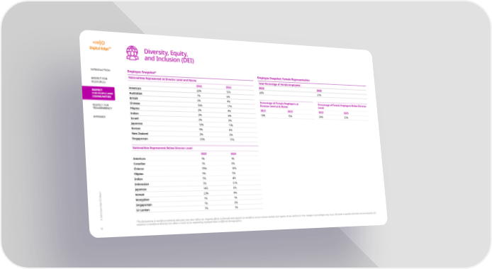 Diversity, Equity, and Inclusion (DEI) 8 INTRODUCTION Employee Snapshot Employee Snapshot: Female Representation RESPECT FOR Nationalities Represented at Director Level and Above: Total Percentage of Female Employees: 2022 2023 RESOURCES 2022 2023 22% 21% American 20% 15% RESPECT Australian 7% 6% FOR PEOPLE AND COMMUNITIES British 5% 4% Percentage of Female Employees at Percentage of Female Employees Below Director Chinese 16% 17% Director Level and Above: Level: RESPECT FOR Filipino 2% 4% 2022 2023 2022 2023 TRANSPARENCY Indian 2% 6% 18% 15% 24% 22% APPENDIX Israeli 2% 2% Japanese 12% 11% Korean 9% 6% New Zealand 2% 2% Singaporean 25% 17% Nationalities Represented Below Director Level: 2022 2023 American 1% 1% Canadian 1% 0% Chinese 35% 10% Filipino 9% 5% Indian 5% 4% Indonesian 3% 61% Japanese 14% 6% Korean 23% 8% Mongolian 1% 1% Singaporean 1% 3% Sri Lankan 7% 1% © 2024 Digital Edge ESG Report 8 The 昀氀uctuations in workforce ethnicity data year over year re昀氀ect our ongoing e昀昀orts to diversify and expand our workforce across various markets and regions. As we continue to hire, changes in percentages may occur. Decreases in speci昀椀c ethnicities are not indicative of a reduction in workforce diversity but rather a result of our expanding employee base in di昀昀erent demographics. 25