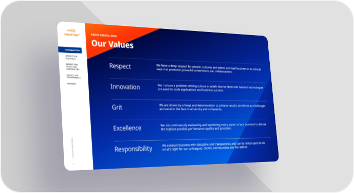 ABOUT DIGITAL EDGE Our Values INTRODUCTION RESPECT FOR RESOURCES We have a deep respect for people, cultures and talent and lead business in an ethical RESPECT FOR Respect way that promotes powerful connections and collaborations. PEOPLE AND COMMUNITIES RESPECT FOR TRANSPARENCY APPENDIX We nurture a problem-solving culture in which diverse ideas and nascent technologies Innovation are used to scale applications and business success. Grit We are driven by a focus and determination to achieve results. We thrive on challenges and excel in the face of adversity and complexity. We are continuously evaluating and optimizing every aspect of our business to deliver Excellence the highest possible performance quality and precision. We conduct business with discipline and transparency and can be relied upon to do Responsibility what’s right for our colleagues, clients, communities and the planet. © 2024 Digital Edge ESG Report 5