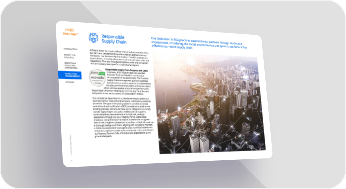 Responsible Our dedication to ESG practices extends to our partners through continuous Supply Chain engagement, considering the social, environmental and governance factors that in昀氀uence our entire supply chain. INTRODUCTION At Digital Edge, we require ethical and compliant practices from our partners, vendors and suppliers that are aligned with our RESPECT FOR standards. Our Business Partner Code of Conduct outlines our expectations, ensuring adherence to all relevant laws, rules and RESOURCES regulations. This also includes compliance with anti-corruption RESPECT FOR and anti-bribery laws speci昀椀c to operational regions. PEOPLE AND COMMUNITIES Responsible Supply Chain Progress and Goals In January 2024, Digital Edge was awarded RESPECT FOR EcoVadis’ Platinum Medal in our 昀椀rst year TRANSPARENCY of completion of its assessment. The EcoVadis supply chain management platform assesses businesses on various aspects of sustainability APPENDIX JAN 2024 including environmental, labor and human rights, ethics and sustainable procurement performance. Digital Edge’s Platinum Medal puts us in the top 1% of the best companies in our sector across 21 sustainability criteria. Our compliance department is currently working to update our Business Partner Code of Conduct letters, noti昀椀cations and other processes. The goal of this policy update is to solicit an annual commitment and certi昀椀cation of ESG compliance to build on our existing practices and ensure there are no obligations to comply outside Digital Edge’s own policy. Additionally, all suppliers, particularly those deemed medium to high risk, undergo assessment through our GAN Integrity Portal. Digital Edge employs a comprehensive framework to determine a supplier’s level of risk. Suppliers categorized as medium or high risk undergo a thorough background check, aligning with our goal to maintain a 100% risk assessment coverage by 2025. Continual assessment and process updates enable us to consistently revise and enhance our Business Partner Code of Conduct and expectations as we grow and expand. © 2024 Digital Edge ESG Report 31