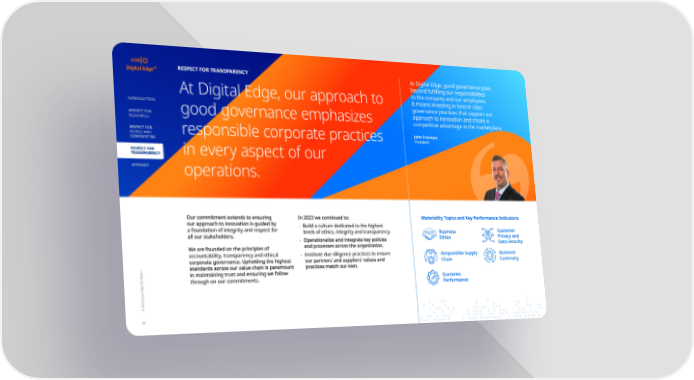 RESPECT FOR TRANSPARENCY At Digital Edge, good governance goes beyond ful昀椀lling our responsibilities At Digital Edge, our approach to to the company and our employees. It means investing in best-in-class governance practices that support our INTRODUCTION good governance emphasizes approach to innovation and create a RESPECT FOR competitive advantage in the marketplace. RESOURCES RESPECT FOR responsible corporate practices John Freeman PEOPLE AND President COMMUNITIES RESPECT FOR in every aspect of our TRANSPARENCY APPENDIX operations. Our commitment extends to ensuring In 2023 we continued to: Materiality Topics and Key Performance Indicators: our approach to innovation is guided by • Build a culture dedicated to the highest a foundation of integrity and respect for levels of ethics, integrity and transparency. Business Customer all our stakeholders. Privacy and • Operationalize and integrate key policies Ethics We are founded on the principles of and processes across the organization. Data Security accountability, transparency and ethical • Institute due diligence practices to ensure Responsible Supply Business corporate governance. Upholding the highest our partners’ and suppliers’ values and Chain Continuity standards across our value chain is paramount practices match our own. in maintaining trust and ensuring we follow through on our commitments. Economic Performance © 2024 Digital Edge ESG Report 28