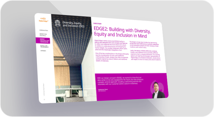 Diversity, Equity, CASE STUDY and Inclusion (DEI) EDGE2: Building with Diversity, INTRODUCTION Equity and Inclusion in Mind RESPECT FOR RESOURCES RESPECT Digital Edge’s newly constructed EDGE2 facility in The design concept also includes the intertwining FOR PEOPLE AND Jakarta was designed with core concepts and features of high tech and traditional as a symbolic celebration COMMUNITIES to re昀氀ect and celebrate the local values and culture. of the Indonesian people and their merging of older In addition to celebrating beauty and designing for traditions with modern ideas. RESPECT FOR human delight, the concept integrated culture, spirit, TRANSPARENCY place and the meaningful integration of art. Lastly, the design of EDGE2 e昀昀ectively combines modern and traditional arts to provide a di昀昀erent APPENDIX One of the key considerations in the design philosophy experience that is uniquely Indonesian. The resulting was the incorporation of iconic and traditional space is an inspiring and energetic representation of craftmanship of batik, designs that often incorporate Digital Edge, its innovative employees, valued visitors symbols inspired by nature, folklore and traditional and respect for the rich history and culture of Jakarta. beliefs of Indonesia. With our design concept in EDGE2, we wanted to show that our data center is not only equipped for the future, but also embraces a people-centred approach, exuding a welcoming warmth that resonates with our customer-centric culture in Indonesia. Stephanus Oscar CEO, EDGE DC © 2024 Digital Edge ESG Report 26