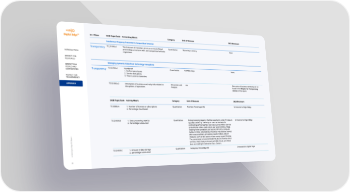 D.E. Pillars SASB Topic/Code Accounting Metric Category Unit of Measure 2023 Disclosure Intellectual Property Protection & Competitive Behavior TC_SI-520a.1 Total amount of monetary losses as a result of legal Transparency Quantitative Reporting currency None proceedings associated with anti-competitive behavior regulations INTRODUCTION RESPECT FOR RESOURCES Managing Systemic Risks from Technology Disruptions RESPECT FOR PEOPLE AND TC-SI-550a.1 Number of Transparency Quantitative Number, Days None COMMUNITIES 1. Performance issues 2. Service disruptions RESPECT FOR 3. Total customer downtime TRANSPARENCY APPENDIX TC-SI-550a.2 Description of business continuity risks related to Discussion and n/a Discussion of business continuity can be disruptions of operations Analysis found in the Respect for Transparency section of this report. SASB Topic/Code Activity Metric Category Unit of Measure 2023 Disclosure TC-SI000.A 1. Number of licenses or subscriptions Quantitative Number, Percentage (%) Immaterial to Digital Edge 2. Percentage cloud based TC-SI-000.B 1. Data processing capacity Quantitative Data processing capacity shall be reported in units of measure Immaterial to Digital Edge 2. Percentage outsourced typically tracked by the entity or used as the basis for contracting software and IT services, such as Million Service Units (MSUs), Million Instructions per Second (MIPS), Mega Floating Point Operations per Second (MFLOPS), compute cycles, or other. Alternatively, the entity may disclose owned and outsourced data processing needs in other units of measure, such as rack space or data center square footage. The percentage outsourced shall include On-Premise cloud services, those that are hosted on Public Cloud, and those that are residing in Colocation Data Centers. TC-SI-000.C 1. Amount of data storage Quantitative Petabytes, Percentage (%) Immaterial to Digital Edge © 2024 Digital Edge ESG Report 2. percentage outsourced 38